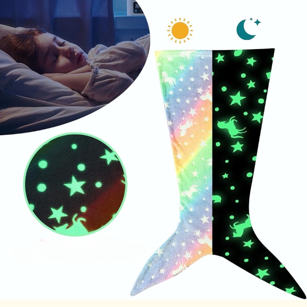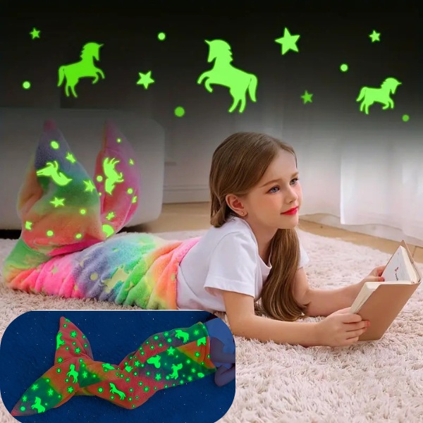 Deka MERMAIDREAM svítí ve tmě a poskytuje uklidňující světlo, které zmírňuje noční strach. Stačí ji vystavit dennímu světlu na 20 minut a bude jemně svítit celou noc. Vyberte si design se žraločím ocasem nebo ocasem mořské panny, který dodá vašemu dítěti kouzlo při spánku.