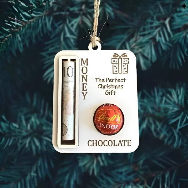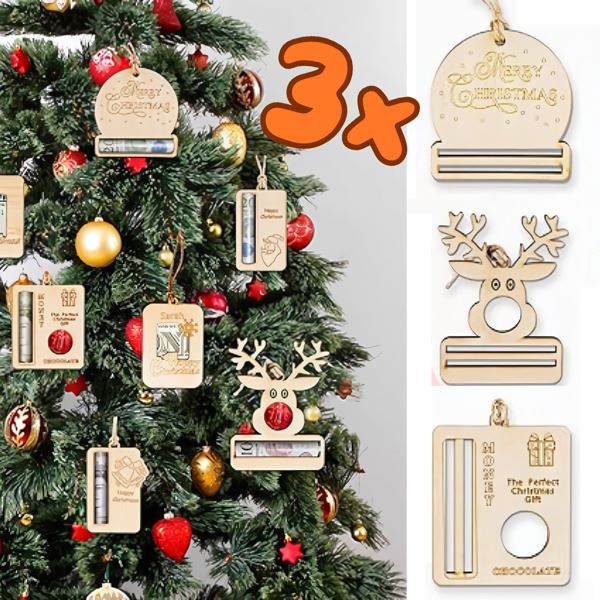 📦 Balení obsahuje: 3x Vánoční ozdoby s klipem na peníze (vzory: 1x sob, 1x dárková krabička, 1x cetka s textem „Veselé Vánoce“).